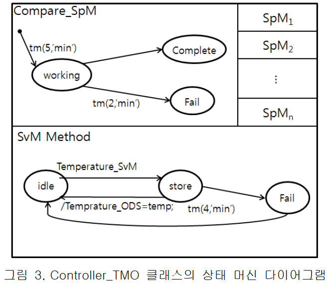 • SvM 영역: 외부에 노출되므로 클래스의 상태 변화(idle, store, fail 등)를 나타낸다. 트랜지션에 시간 제약 조건을 명시하여 데드라인 초과 시 Fail 상태로 전이되도록 설계한다.