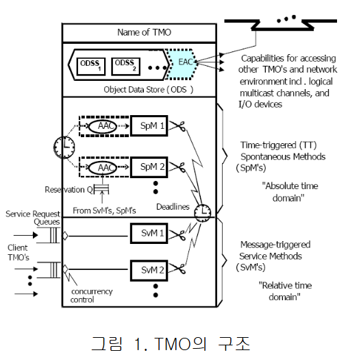 TMO (Time-Triggered Message-Triggered Object) TMO는 객체 모델을 실시간 시스템에 적합하도록 확장한 것으로, 분산 실시간 시스템 개발을 지원한다. TMO 객체는 크게 세 부분으로 구성된다.