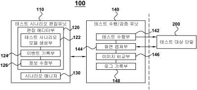 2제 1 항에 있어서, 상기 테스트 시나리오 편집유닛은, 상기 테스트 시나리오 모델을 생성하는 테스트 시나리오 모델 생성부; 상기 이벤트를 기록하는 이벤트 기록부; 및 테스트 수행 순서를 변경하는 정보 수정부를 포함하여 구성됨을 특징으로 하는 상태 기반의 테스트 시나리오 모델을 이용한 GUI 테스트 장치.
