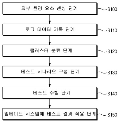| 6 | 센서가 외부 환경 요소를 센싱하는 단계; 로거가 상기 센싱한 외부 환경 요소를 로그 데이터로 기록하는 단계; 클러스터 유닛이 상기 로그 데이터를 소정 조건에 따라 클러스터링 하여 분류하고, 분류된 모든 클러스터에 대해 테스트 시나리오를 구성하는 단계; 및 테스트 수행 유닛이 상기 테스트 시나리오에 따라 테스트를 수행하는 단계를 포함하고, 상기 임베디드 시스템에 상기 테스트 수행 결과가 업그레이드되는 것을 특징으로 하는, 로그 모니터링 기반의 임베디드 시스템 테스트 방법. |