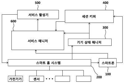 1사용자의 명령에 따라 세션 등록 및 해제 요청을 입력하는 스마트폰; 상기 스마트폰의 세션 등록 및 해제 요청을 바탕으로 세션을 관리하되, 기기 상태 매니저로부터 스마트 홈 시스템의 스마트 가전 및 센서들의 업데이트된 상태정보를 전달 받으면 그 정보들을 통해 등록된 세션의 유지조건을 판단하여 세션 유지상태를 관리하며, 세션 유지상태가 업데이트된 세션이 있을 경우 해당 세션을 서비스 매니저에게 알려주는 세션 키퍼; 상기 스마트 가전이나 센서로부터 이벤트가 발생할 때마다 상기 스마트 홈 시스템으로부터 업데이트된 정보를 전달받으며, 이로부터 스마트 가전 및 센서들에 대한 상태 정보를 얻어 관리하되, 기기 상태 매니저의 정보 업데이트가 완료되면 업데이트된 기기 상태 정보들을 상기 세션 키퍼와 서비스 매니저로 전달하는 기기 상태 매니저; 상기 스마트폰으로부터 서비스 등록 및 해제 요청을 받아 서비스 등록 및 해제하고, 상기 세션 키퍼로부터 업데이트된 세션 유지상태 정보를 받아 서비스 수행 여부를 판단함에 있어서, 특정한 세션이 유지되는 동안 상기 특정한 세션에 대응하는 서비스 시작 이벤트가 상기 상태정보를 통해 수신되면 이에 대응하여 미리 정해진 서비스 활성화 시나리오를 출력하는 서비스 매니저; 상기 서비스 매니저로부터 받은 상기 서비스 활성화 시나리오를 상기 스마트홈 시스템이 사용하는 메시지로 생성하고, 생성된 메시지를 상기 스마트홈 시스템으로 전달하여 서비스의 제공을 가능하게 하는 서비스 활성기;를 포함하는 세션 기반의 홈 오토메이션 시스템.