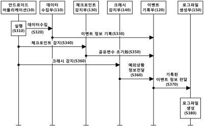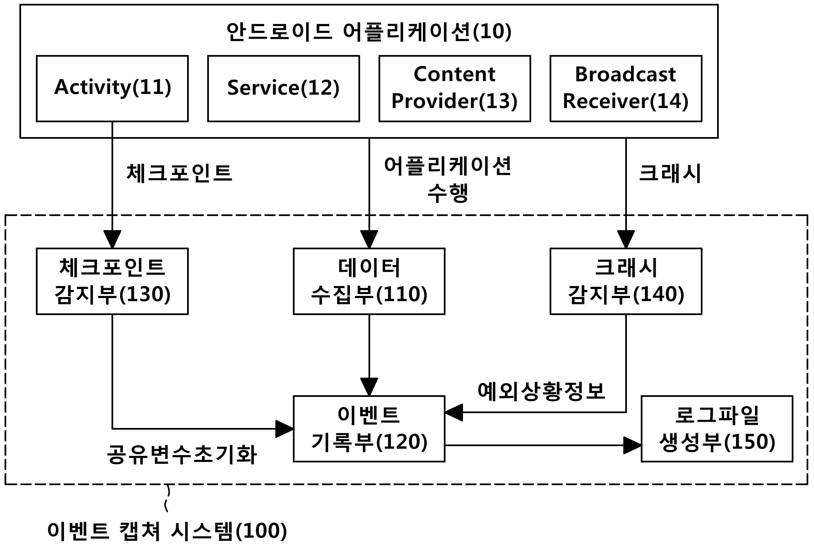 1특정 어플리케이션 동작시, 실행되는 컴포넌트, 쓰레드 정보 및 상기 쓰레드에 의해 출력되는 공유 변수(shard variable) 정보를 수집하는 데이터 수집부; 상기 데이터 수집부에 의해 수집된 이벤트 정보들을 기록하는 이벤트 기록부; 상기 어플리케이션 동작 중 새로운 컴포넌트의 동작이 감지가 되면, 상기 이벤트 기록부에 의해 기록되는 이벤트 정보 중 공유 변수 정보를 삭제하는 체크포인트 감지부; 상기 어플리케이션 동작 중 크래시(crash)가 발생하는지 여부를 감지하는 크래시 감지부; 및 상기 크래시 감지부에 의해 크래시가 감지되면, 상기 이벤트 기록부에 의해 기록된 이벤트 정보들이 저장된 로그 파일을 생성하는 로그파일 생성부;를 포함하는 어플리케이션의 이벤트 캡쳐 시스템.