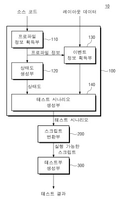 11프로파일 정보 획득부가 애플리케이션의 소스 코드로부터 상기 애플리케이션에 포함된 복수 개의 액티비티 및 상기 액티비티를 구성하는 함수에 관한 정보를 포함하는 프로파일 정보를 획득하는 단계; 상태도 생성부가 상기 프로파일 정보를 기반으로 상기 복수 개의 액티비티 간의 연결 관계를 나타내고 상기 액티비티의 라이프 사이클에 관한 정보가 포함된 상태도를 생성하는 단계; 이벤트 정보 획득부가 상기 프로파일 정보 및 상기 액티비티의 레이아웃을 구현하는 데이터 중 적어도 하나로부터 상기 복수 개의 액티비티 간의 전환과 관련된 이벤트 정보를 획득하는 단계; 및 테스트 시나리오 생성부가 상기 상태도 및 상기 이벤트 정보를 기반으로 상기 애플리케이션에 대한 테스트 시나리오를 생성하는 단계; 를 포함하며, 상기 이벤트 정보를 획득하는 단계는: 상기 프로파일 정보로부터 상기 이벤트를 발생시키는 사용자 입력을 식별하는 단계; 및 상기 액티비티의 레이아웃 정보를 포함하는 XML 데이터로부터 상기 이벤트를 발생시키는 상기 액티비티의 컴포넌트를 식별하는 단계를 포함하고, 상기 테스트 시나리오를 생성하는 단계는: 상기 상태도로부터 예비 테스트 시나리오를 생성하는 단계; 및 상기 예비 테스트 시나리오 중 상기 사용자 입력과 관련된 스테이지에 해당 사용자 입력 방법을 포함시키고, 상기 컴포넌트의 조작과 관련된 스테이지에 해당 컴포넌트의 명칭을 포함시켜 최종 테스트 시나리오를 생성하는 단계; 를 포함하며, 상기 복수 개의 액티비티는 각각 에디트 텍스트 메뉴 컴포넌트 및 버튼 컴포넌트를 포함하는 테스트 시나리오 생성 방법.